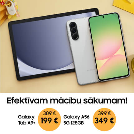 Piedāvājums spēkā līdz 31.08.2025. Norādītās cenas attiecas atsevišķi: uz „Galaxy Buds FE” austiņām un „Galaxy Tab A9+ 11" Gray WiFi 128GB” planšetdatoru, Galaxy A56 128GB. Preču skaits ierobežots. Vairāk informācijas pie veikala ekspertiem.